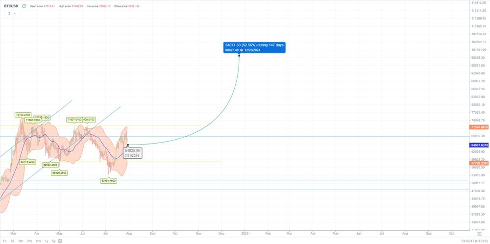 Bollinger Bands and pivot points will be useful in forecasting the price for 2024. One of the potential scenarios is depicted below. If the price consolidates above 71,831, the asset will grow till the end of the summer.
