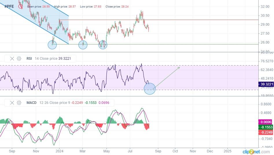 Various timeframes and tools can be used in Pfizer stock technical analysis to assess market trends and determine optimal entry/exit points. Daily and weekly charts are suitable for short-term analysis as they help identify short-term fluctuations and trends. The useful toolkit includes moving averages (MA), which help identify the trend direction, and the relative strength indicator (RSI), which determines the overbought/oversold levels.