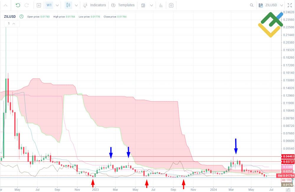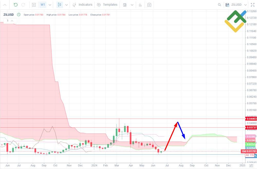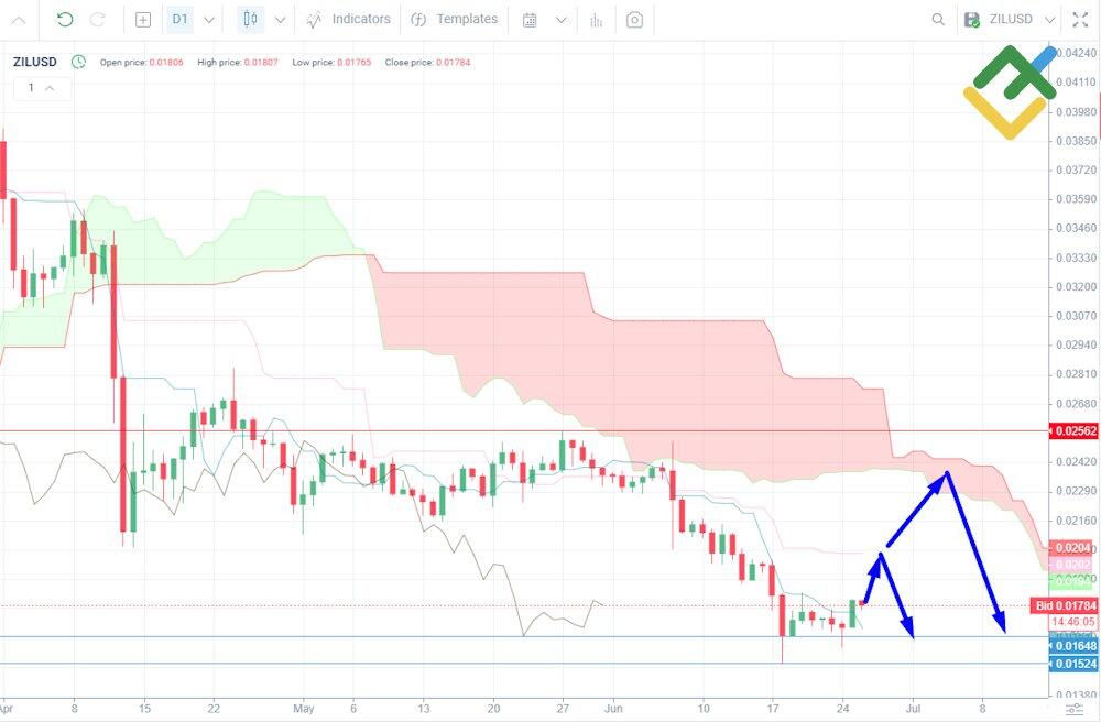 To forecast the ZILUSD rate for three months, it is better to use a daily chart with the Ichimoku indicator. This will allow you to identify various trends and potential pivot points.